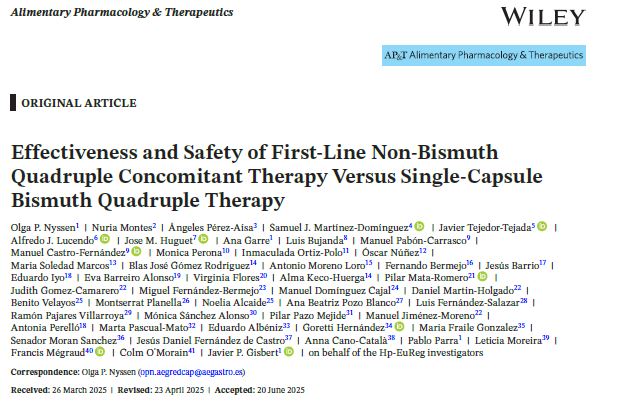 Nyssen, Olga P.; Montes, Nuria; Perez-Aisa, Maria; Martínez-Domínguez, Samuel J.; Tejedor-Tejada, Javier; Lucendo, Alfredo; Huguet, Jose Maria; Garre, Ana; Bujanda, Luis; Pabón-Carrasco, Manuel; Castro-Fernandez, Manuel; Perona, Monica; Ortiz Polo, Inmaculada; Nuñez, Oscar; Marcos, Maria Soledad; Gomez-Rodriguez, Blas; Loro, Antonio Moreno; Bermejo, Fernando; Barrio, Jesús; Iyo, Eduardo; Alonso, Eva Barreiro; Flores, Virginia; Keco Huerga, Alma; Mata-Romero, Pilar; Gomez-Camarero, Judith; Fernandez-Bermejo, Miguel; Dominguez-Cajal, Manuelk; Martín-Holgado, Daniel; Velayos, Benito; Planella, Montserrat; Alcaide, Noelia; Blanco, Ana Beatriz Pozo; Fernández, Luis; Pajares, Ramón; Alonso, Mónica Sánchez; Mejide, Pilar Pazo; Jiménez-Moreno, Manuel; Perelló, Antonia; Pascual-Mato, Marta; Albéniz, Eduardo; Hernández, Goretti; Gonzalez, Maria Fraile; Morán-Sánchez, Senador; Castro, Jesús Daniel Fernández de; Cano Catalá, Anna; Parra, Pablo; Moreira, Leticia; Megraud, Francis; O´Morain, Colm; Gisbert, Javier P. Effectiveness and safety of first-line non-bismuth quadruple concomitant therapy versus single-capsule bismuth quadruple therapy. Aliment Pharmacol Ther. 2025; 62:809–820. DOI: https://doi.org/10.1111/apt.70261